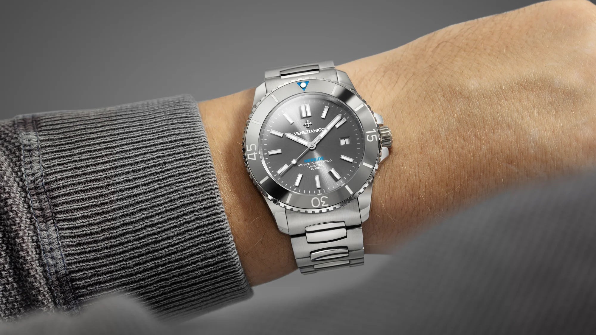 Our dive watch, water-resistant to a depth of 200 meters, takes its name from the Nereide submarine, a marvel of Venetian naval technology. This timepiece is engineered to endure strong stresses, making it particularly well-suited for water sports enthusiasts.