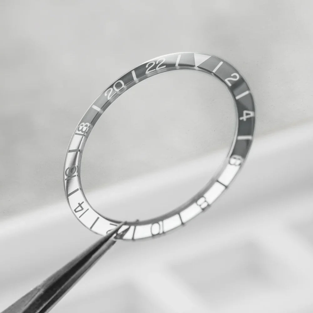The bezel insert is made of BK7 optical crystal and adopts a particular mirror finish in the lower half, a unique feature of the GMT collection. This material has exceptional physical properties. It is lead free, lighter and is endowed with a better quality than other glass crystals. Its properties of low dispersion (with Abbe numbers around 60) and low refraction (≈1.52), combined with high clarity, make it perfect for creating high-precision and durable glass objects.