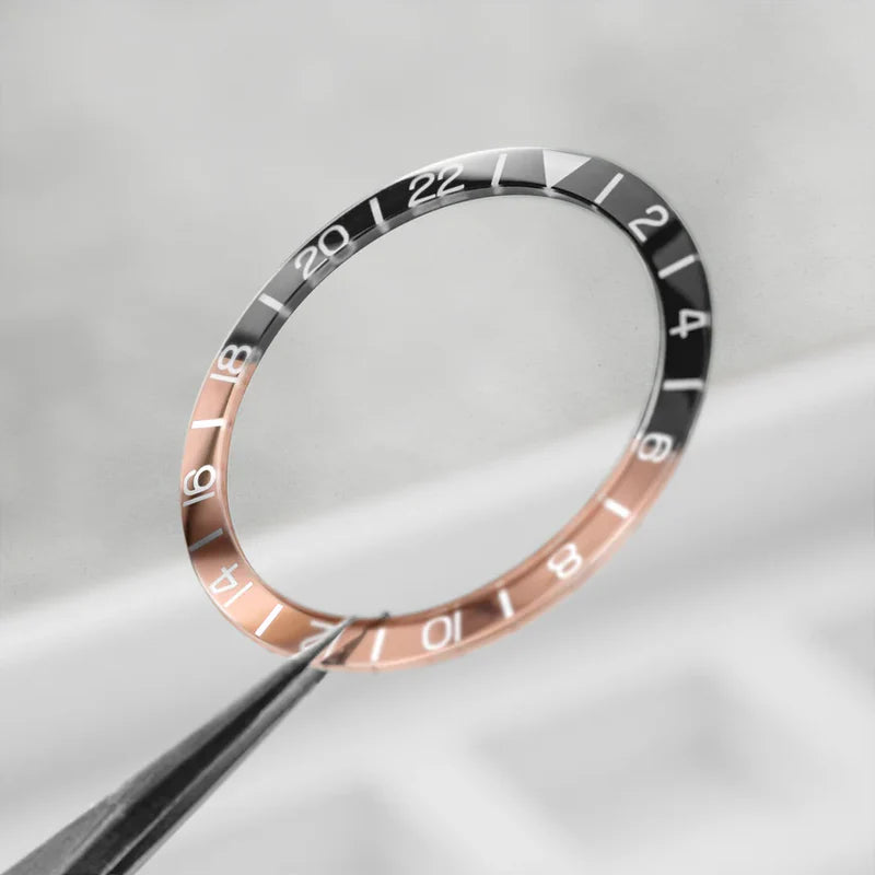 The bezel insert is made of BK7 optical crystal and adopts a particular mirror finish in the lower half, a unique feature of the GMT collection. This material has exceptional physical properties. It is lead free, lighter and is endowed with a better quality than other glass crystals. Its properties of low dispersion (with Abbe numbers around 60) and low refraction (≈1.52), combined with high clarity, make it perfect for creating high-precision and durable glass objects.