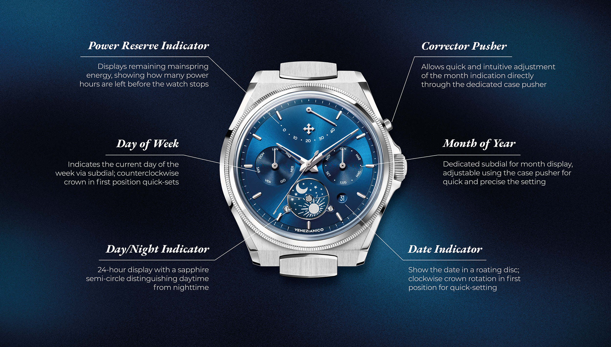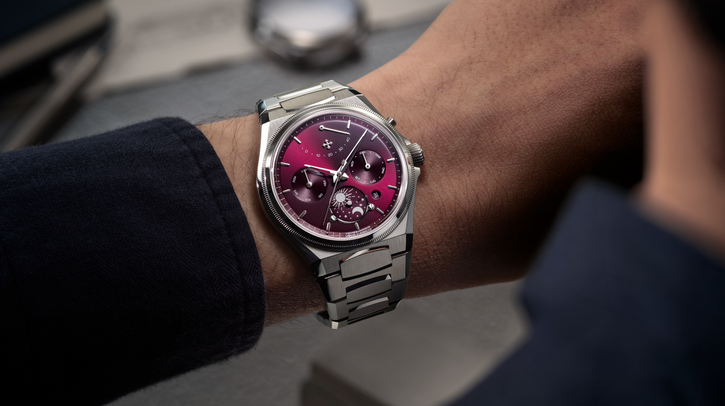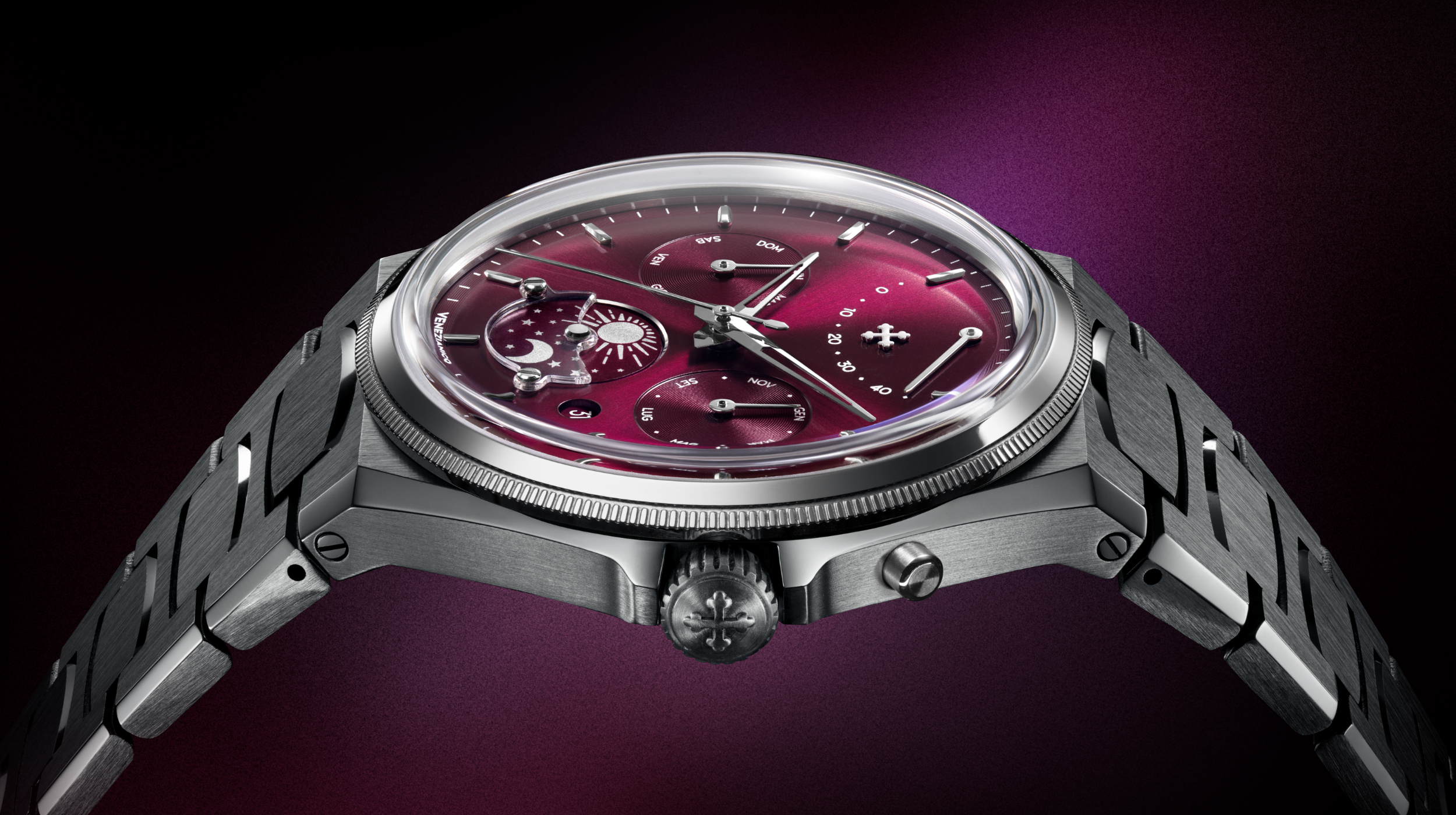 The design is based on a precise approach, inspired by the logic of the Venice Arsenal: modularity, sequence, and control. The automatic calendar defines the layout of the information, while the day-night disc at 6 o'clock introduces a cyclical reading of time. At 12 o'clock, the power reserve indicator is a distinctive and unconventional element, integrated into the structure of the dial. The sapphire crystal half-moon, secured with screws, makes the function visible and defines its operation, contributing to a solid and durable structure.