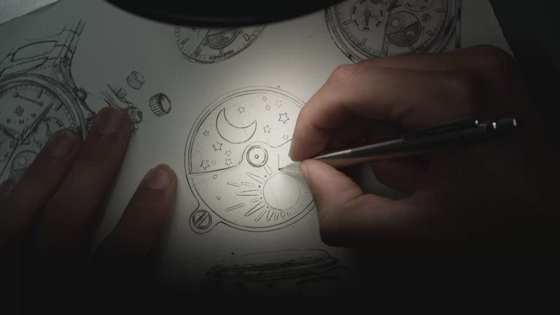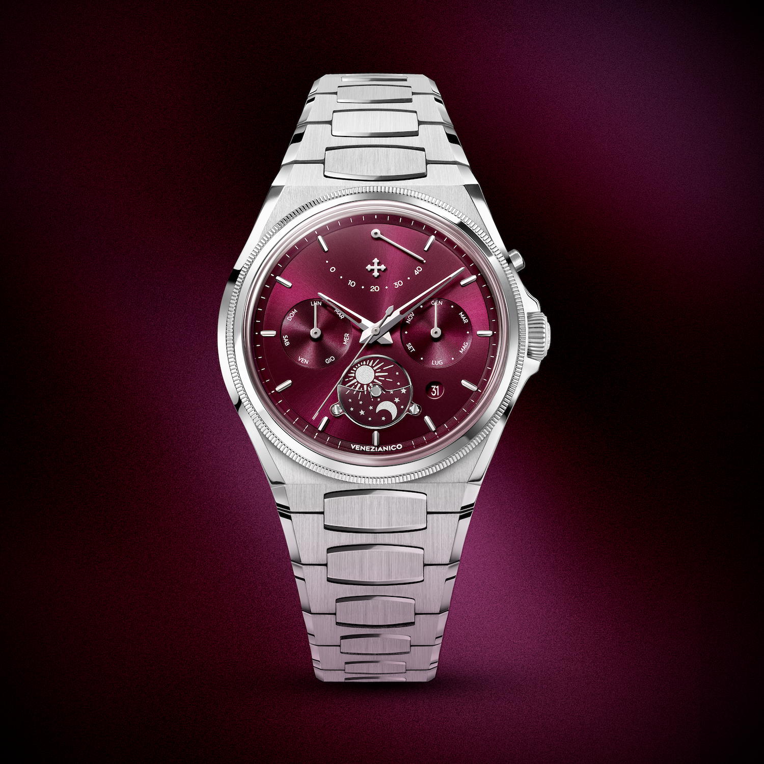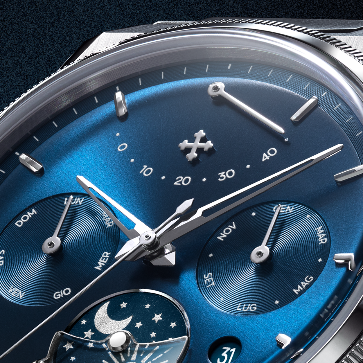 The design is based on a precise approach, inspired by the logic of the Venice Arsenal: modularity, sequence, and control. The automatic calendar defines the layout of the information, while the day-night disc at 6 o'clock introduces a cyclical reading of time. At 12 o'clock, the power reserve indicator is a distinctive and unconventional element, integrated into the structure of the dial. The sapphire crystal half-moon, secured with screws, makes the function visible and defines its operation, contributing to a solid and durable structure.