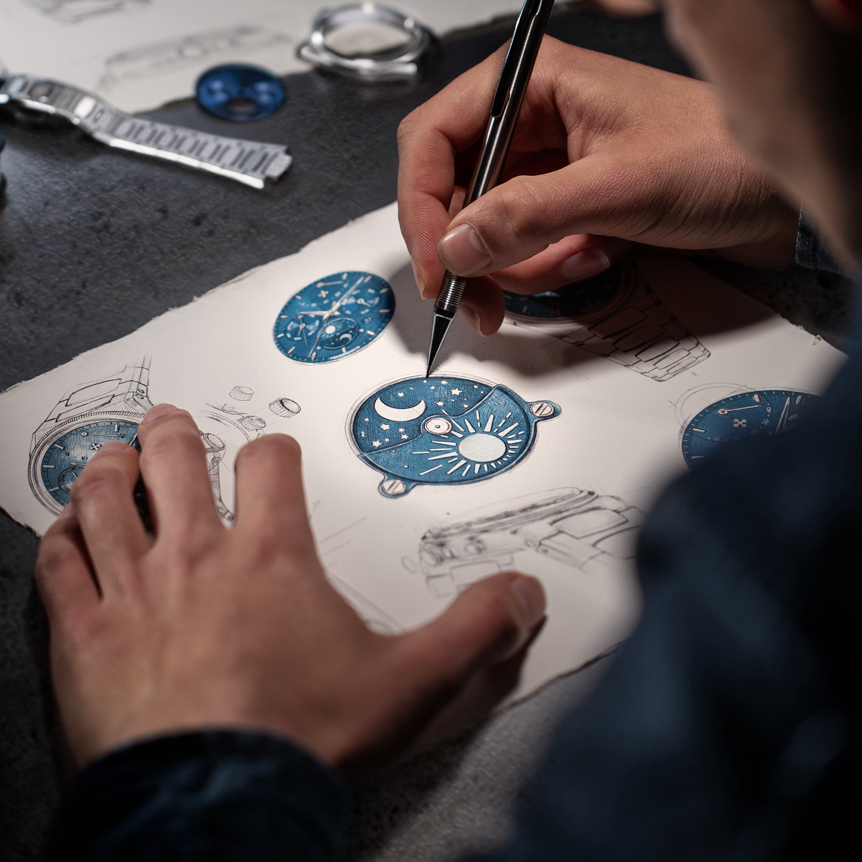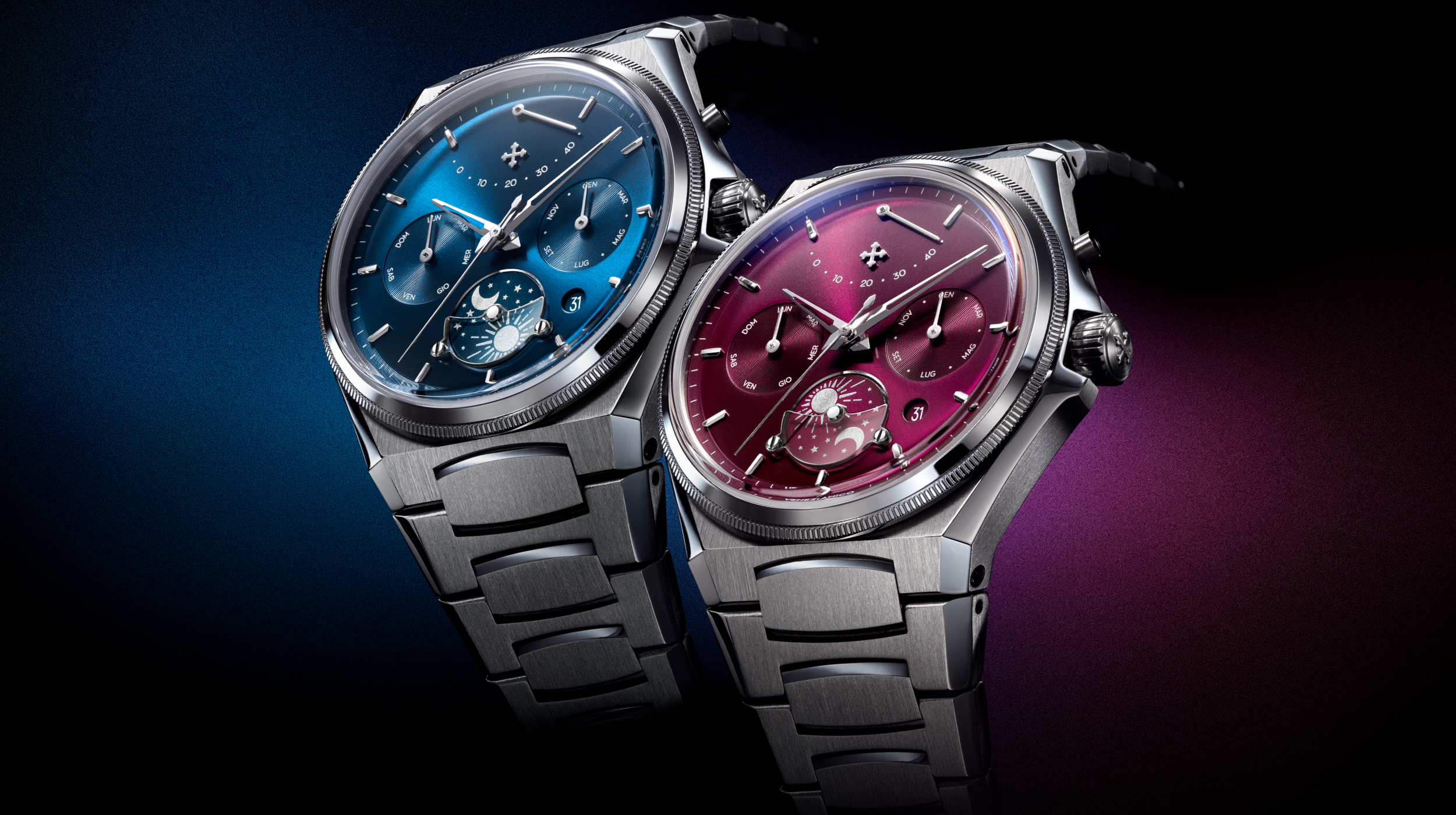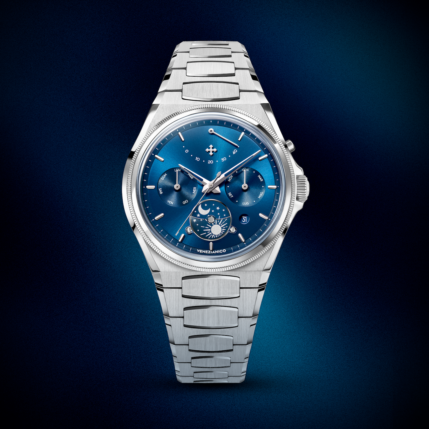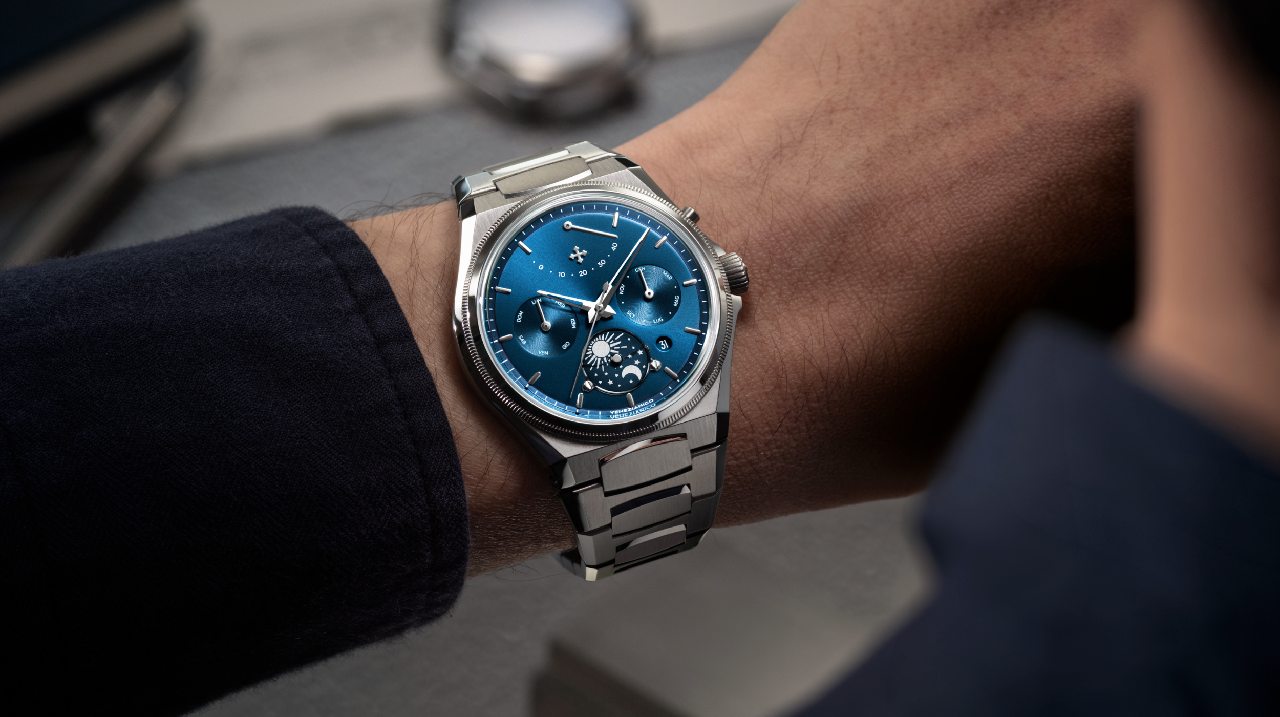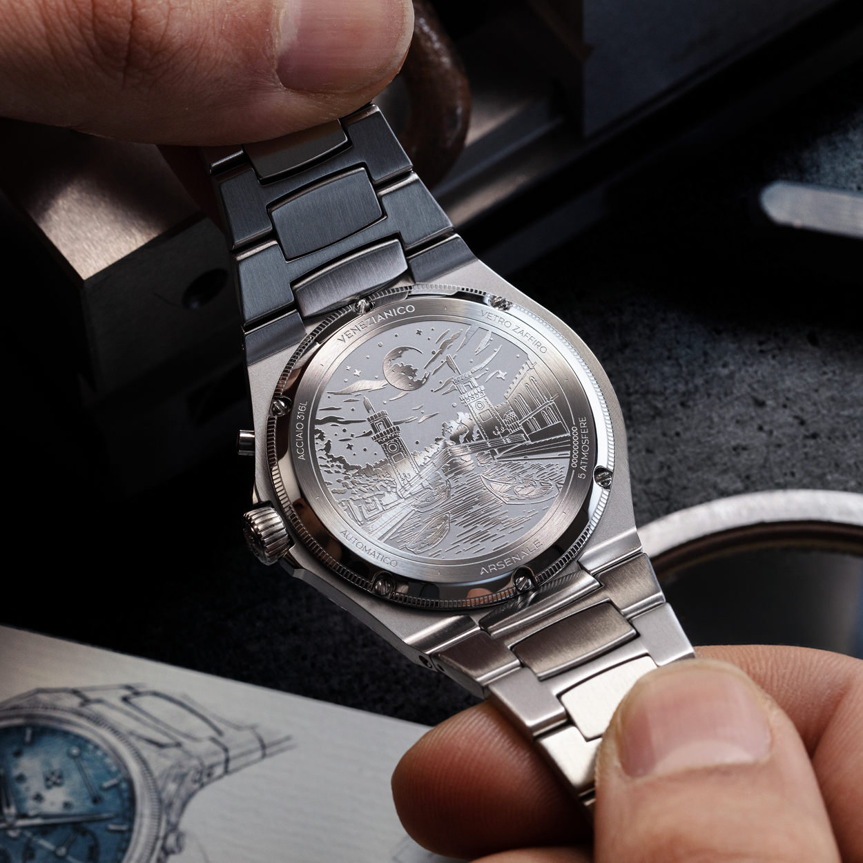 The caseback celebrates the Venice Arsenale, a symbol of balance between tradition and innovation. The same principle is reflected in the watch: skeletonized dauphine hands and polished ingot hour markers interact with a contemporary case and integrated bracelet. The alternating satin and polished finishes enhance its technical character, while the dial, with its layered construction and day-night indicator on a sapphire crescent, adds depth. Like the Arsenale, this timepiece also unites different eras in a solid and balanced design.