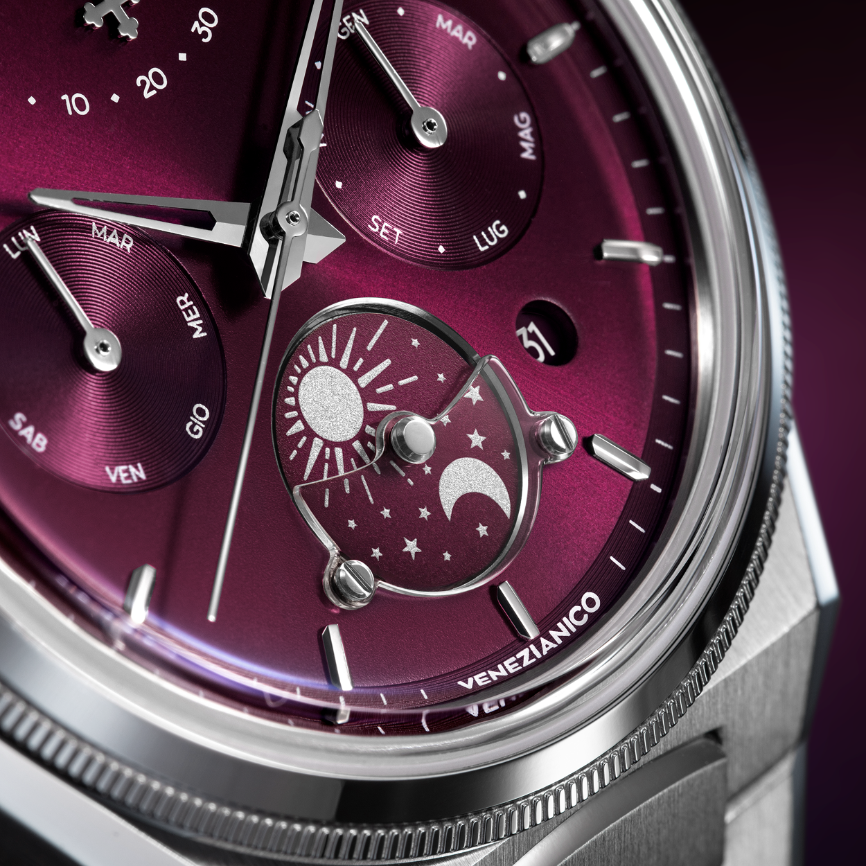 Sunburst finish with concentric subdials, day/ night indicator with a sapphire semi-disc secured by screws