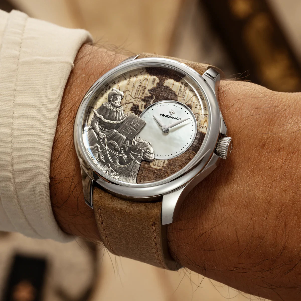 The watch dial celebrates the legendary Marco Polo on the 700th anniversary of his death. This Limited Edition captures the essence of his adventures with a brass bas-relief depicting him on a dromedary, holding "Il Milione." The papyrus background features a Chinese map of Asia, evoking his epic journeys to the East.