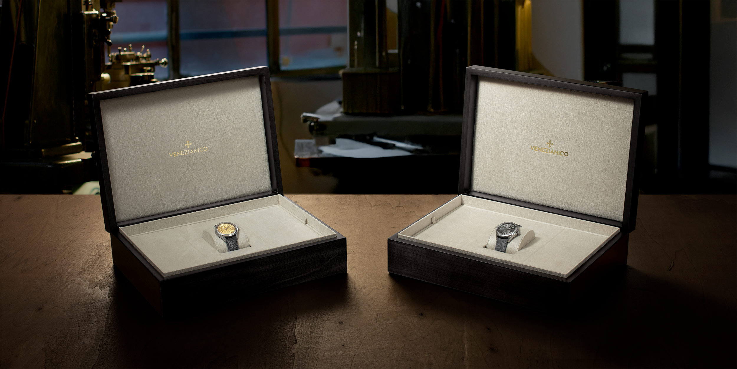The chromatic choice of this limited edition is rooted in the material and historical identity of the city of Venice. Gold recalls the light of stuccoes and mosaics, the reflection of a refined decorative tradition capable of turning architecture into narrative. The graphite tone, deeper and more tactile, instead refers to the craftsmanship of wrought iron that defines the city’s more functional side, from street lamps and gates to the structural elements of boat hulls. Two complementary colours, expressing a culture able to unite elegance and labour, beauty and function, refinement and a deeply industrious spirit.