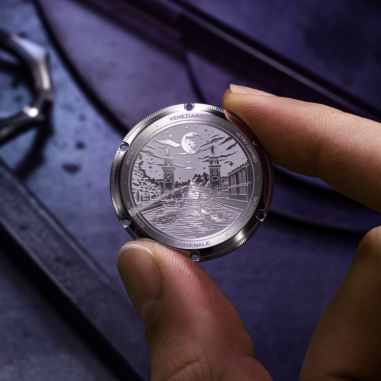 The caseback depicts the Venetian Arsenal, one of the most advanced proto-industrial complexes of its time.