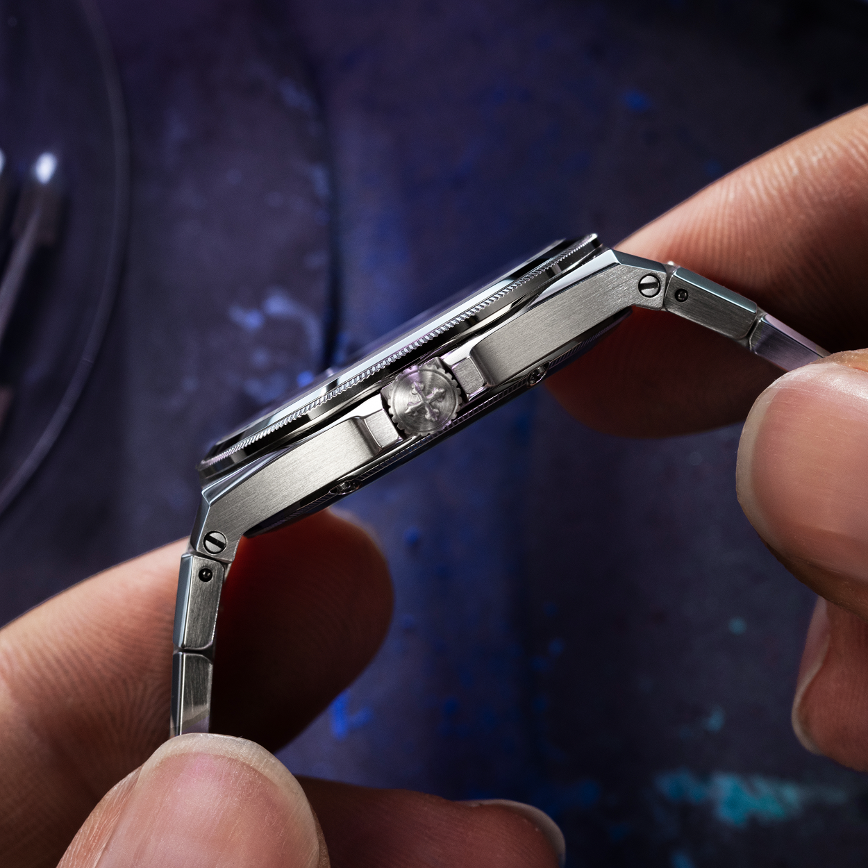 The case construction maintains a clean, continuous line with the integrated bracelet, offering a lightweight and comfortable watch that fits naturally on the wrist.