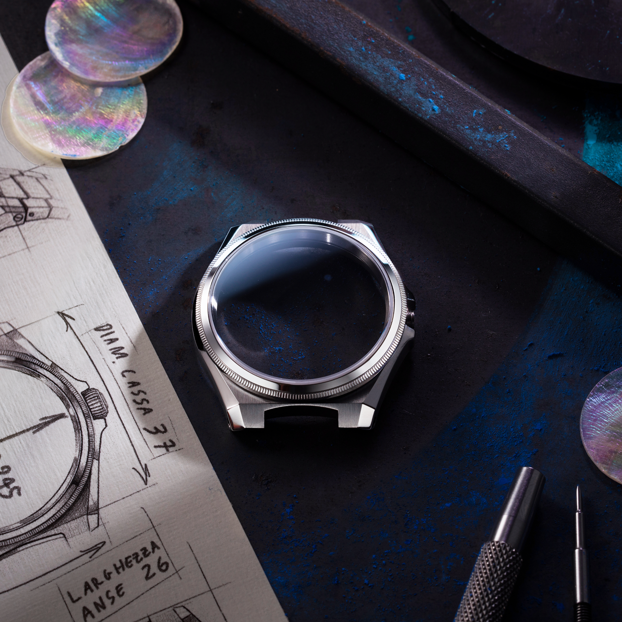 For the Arsenale 37mm, we carefully selected natural mother-of-pearl semi-finished blanks distinguished by a high level of iridescence. After an initial selection phase, the material is cut into a circular shape, thinned, and polished to enhance its depth and natural reflections. Each dial is therefore unique, defined by the intrinsic structure of the mother-of-pearl itself.