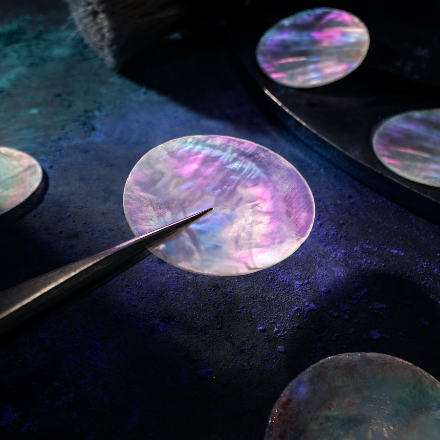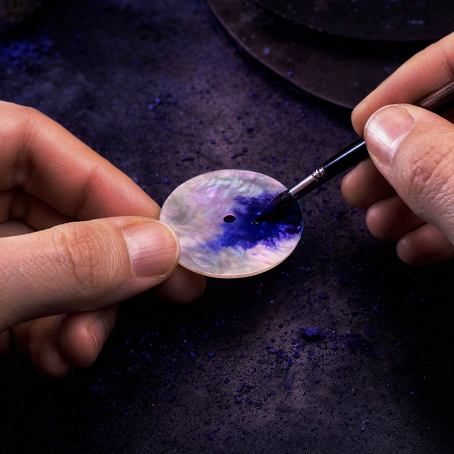Once the disc is prepared, the coloring phase begins. The pigment is applied with great care to achieve a uniform color while preserving the material's natural iridescence. It's a delicate balance: too much color would risk obscuring the depth of the mother-of-pearl. The process is then carried out progressively until the right balance between color and transparency is achieved.