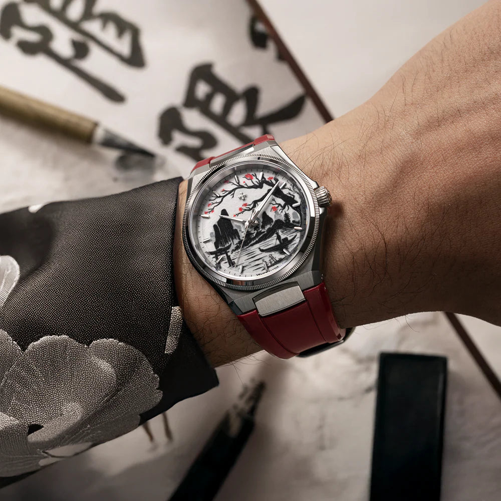Arsenale Sumi-e is born from the same spirit of exploration that guided Venice for centuries along the Silk Road. Just as spices, silks, and ideas once journeyed from East to West, this creation weaves together two worlds united by craftsmanship and the pursuit of harmony. The dial, made from genuine Washi paper, is created through a five-step pad-printing process that recreates the delicacy of ink and its subtle gradients on paper, giving life to a poetic landscape suspended in time.