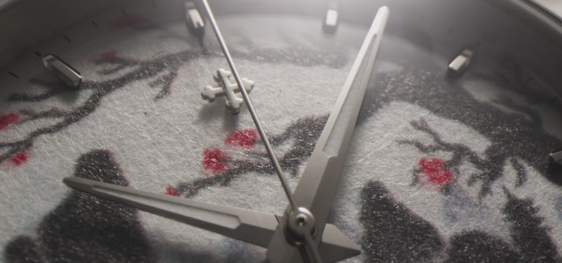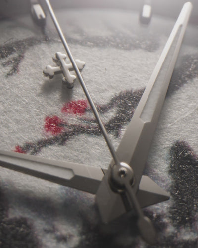 To accompany the watch, a dedicated box has been created that reflects the visual language of the dial, extending the project’s aesthetic beyond the object itself. The surface is decorated with a motif inspired by the original design, reproduced in high definition to preserve the shades and contrasts typical of the Sumi-e technique. On the underside, a short inscription in English and Japanese tells the story behind the concept and the dialogue between art, culture, and technique that guided its development.