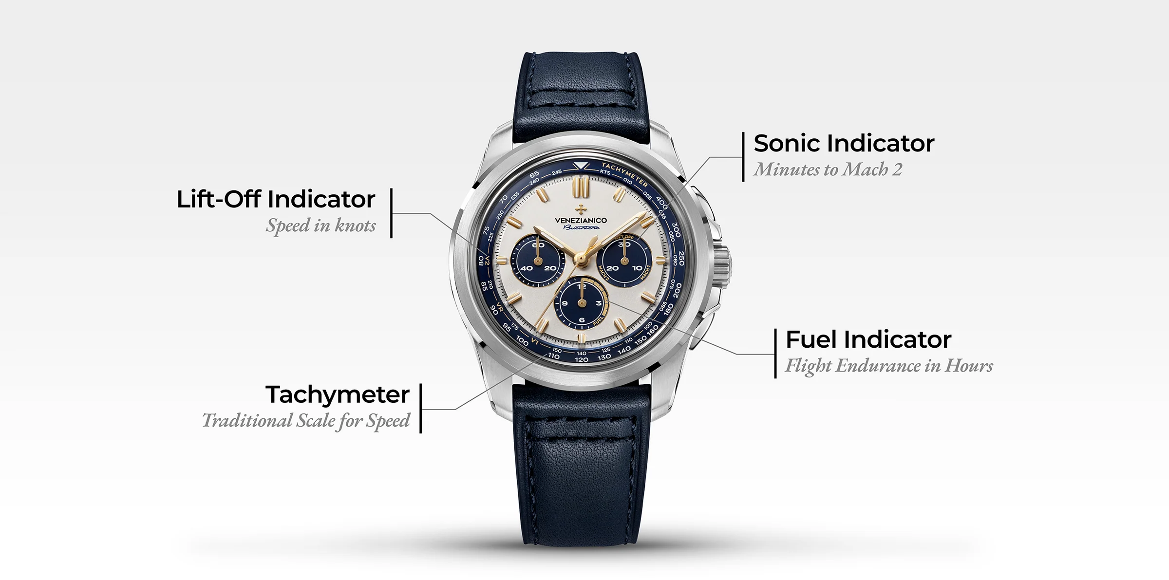A key element for timing the crucial phases of flight, when the pilot had to monitor with absolute precision the time required to reach the target speed. The markers dedicated to Mach 1 and Mach 2 are not mere graphic details: they represent the exact moment when the aircraft broke the sound barrier, turning anticipation into tension and the instant into pure emotion. On the dial of the Bucintoro 1976, this feature becomes a tangible symbol of the supersonic era, where every minute was a conquest.