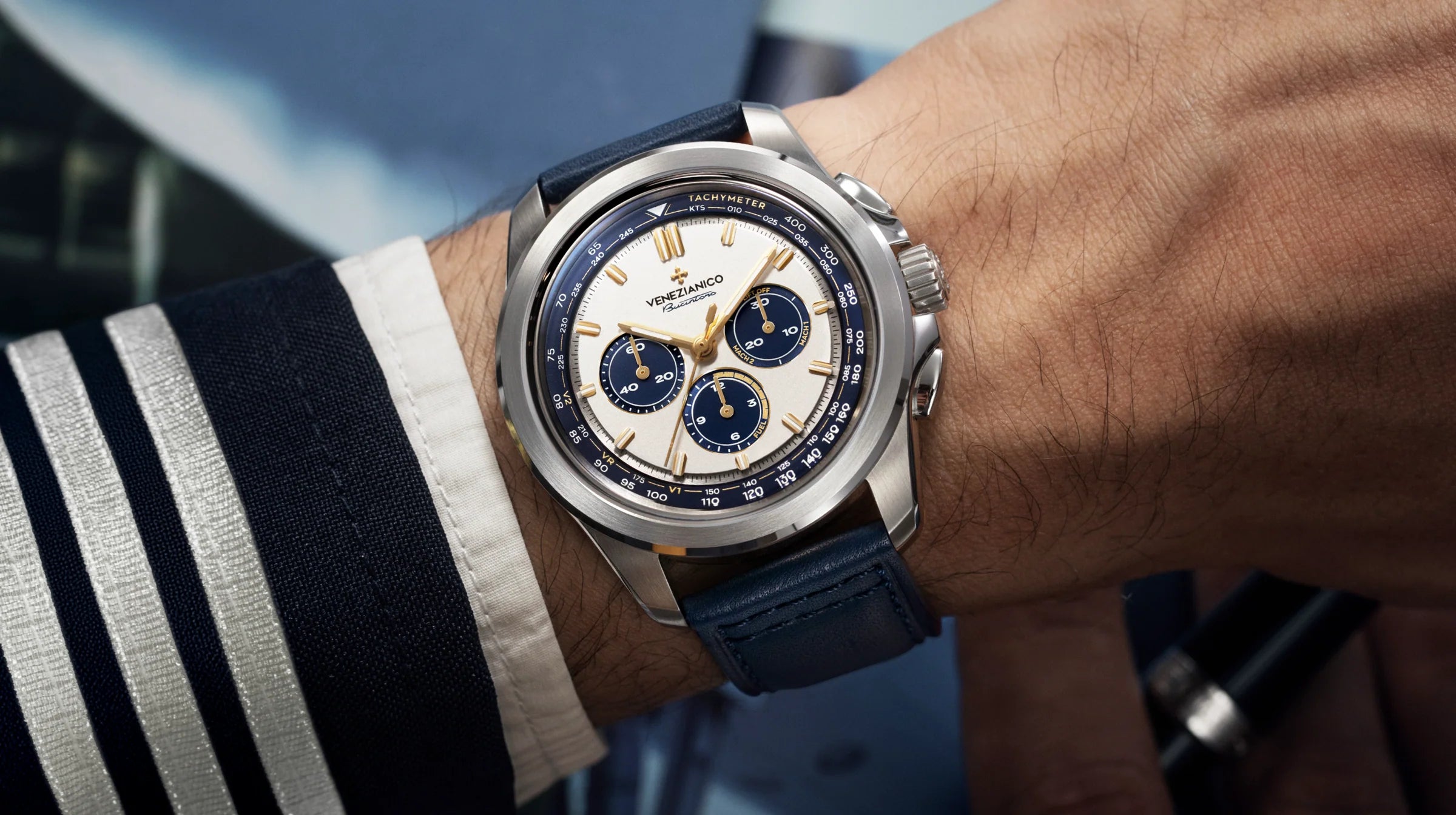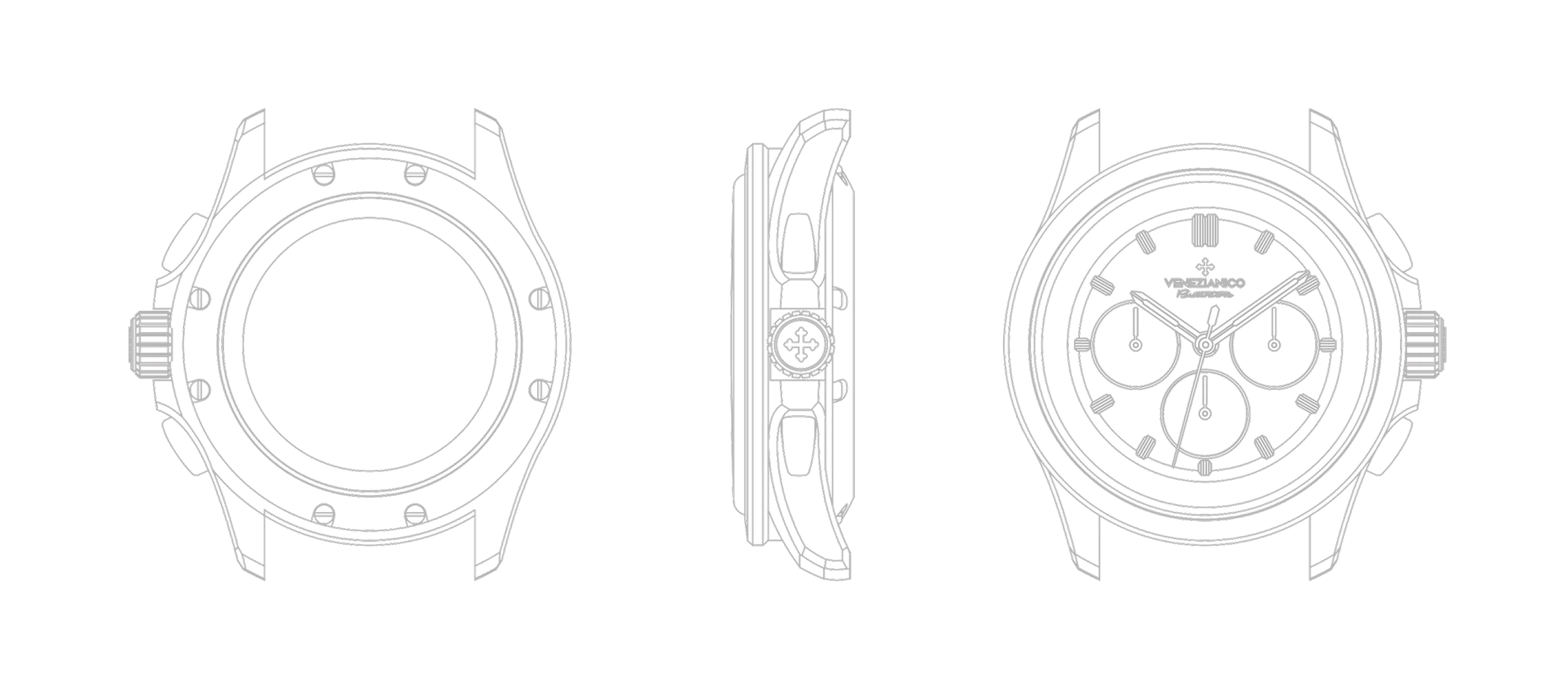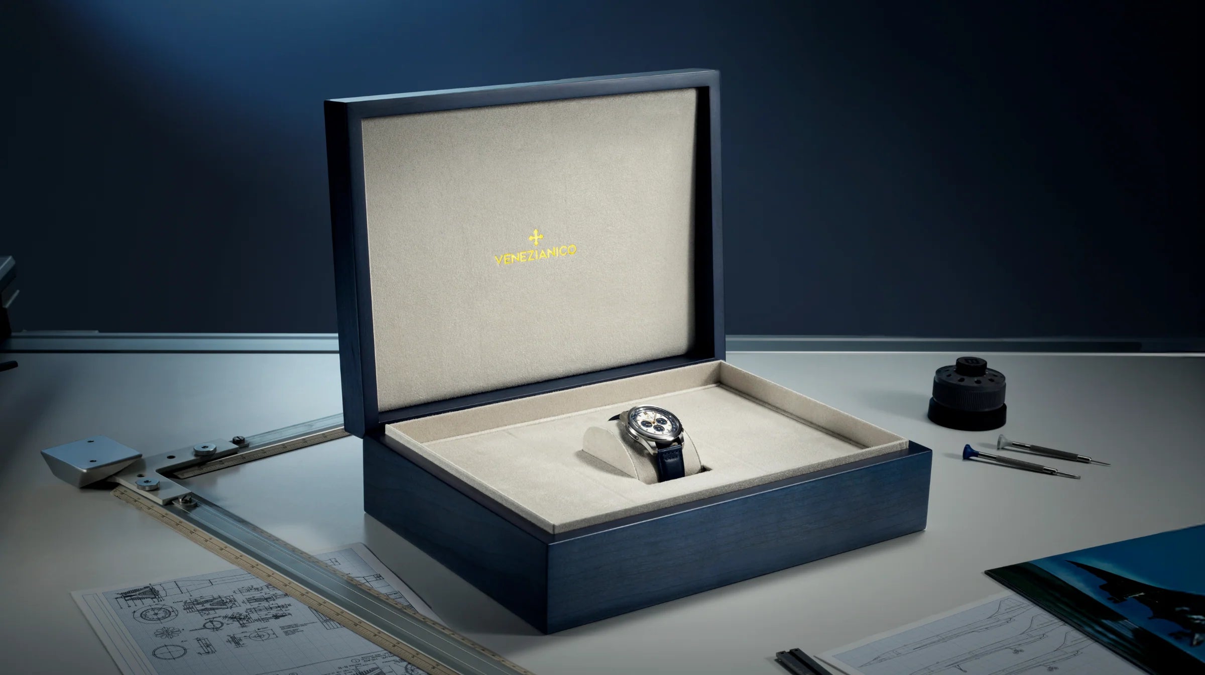 Mounted on the same axis as the hour and minute hands, the central chronograph hand becomes the primary instrument for monitoring speed in real time. Startable, stoppable, and resettable via the pushers, it allows every variation to be recorded instantly. It is the watchmaking equivalent of onboard instruments that translated each fraction of time into operational data. In the Bucintoro 1976, every sweep of the hand measures not only seconds, but tells the rhythm of the journey and the dynamics of flight.