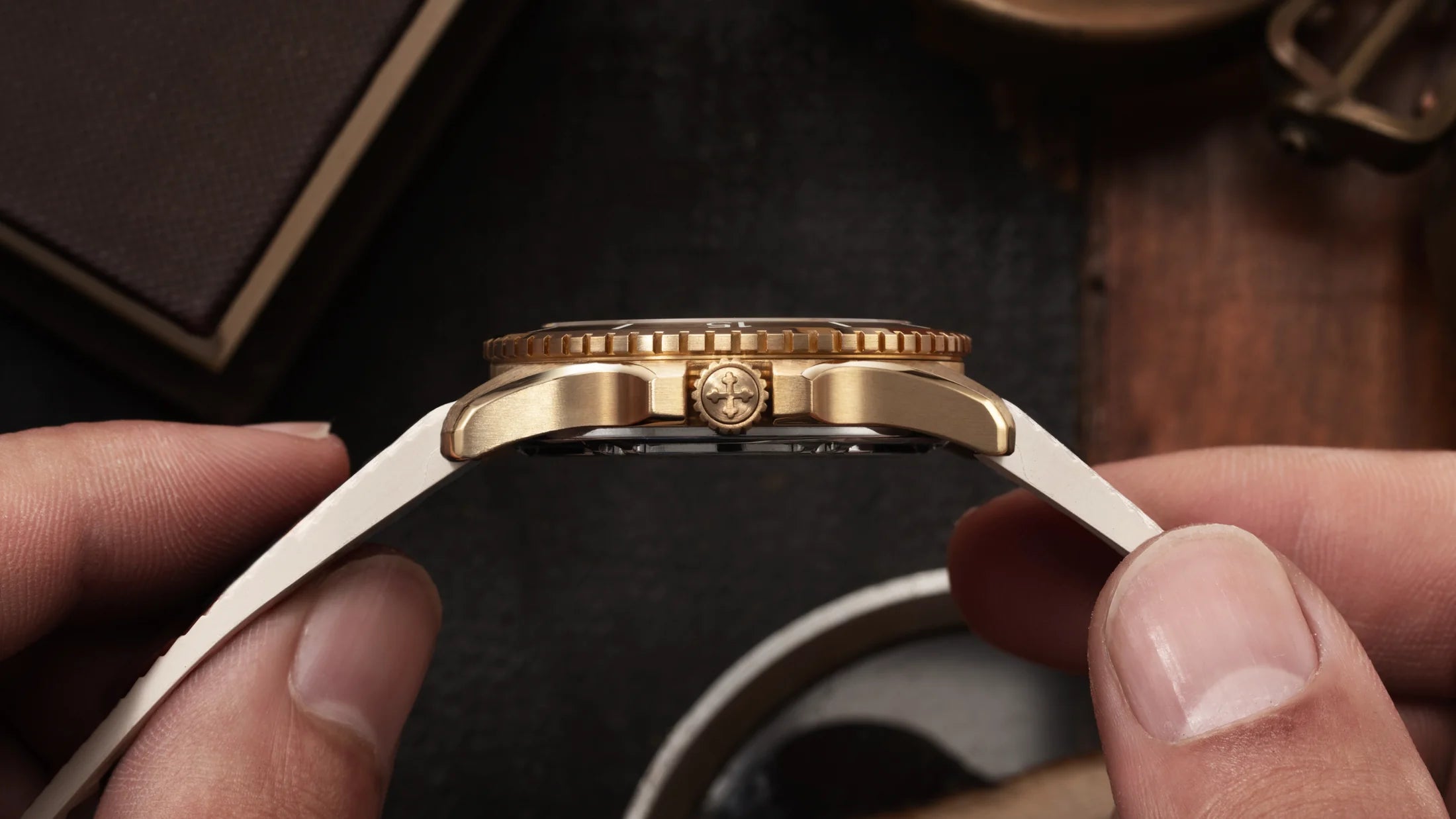 We designed a dedicated dial that stays true to the Nereide style while introducing fresh details. The applied ingot-shaped indices feature a satin-brushed top surface that highlights their geometric form. For the first time, we’ve introduced gilt printing, inspired by 1950s dive watches. Alongside gold-toned text and minute markers, a thin circle frames the dial—paying tribute to vintage aesthetics while preserving a distinctive, modern identity.