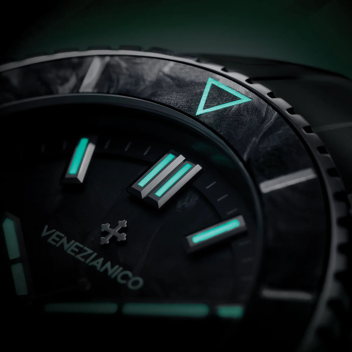 Forged carbon is a new advanced material with exciting technical features. It is obtained from mixed chunks of carbon fibers, submerged into resin and cooked at high pressure and temperature. Fibers reflect light in different directions according to the angle of view for a fascinating visual effect of bringing the dial and the bezel to life.