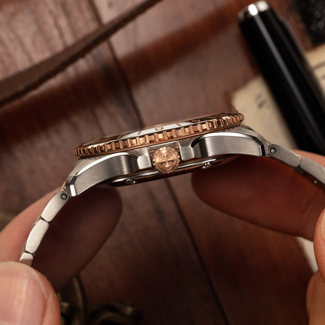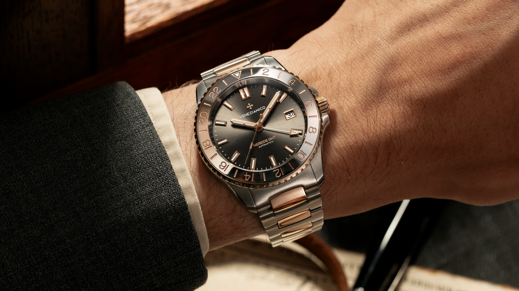 The 39 mm case combines stainless steel with a 5N rose gold IP treatment, achieving a perfect balance of proportion and brightness, while the tungsten bezel defines its profile with refined elegance. The dial, featuring a Soleil finish, reflects light radially, revealing different shades with every movement. Inside, the automatic Miyota 9075 caliber with True GMT function allows the local time to be adjusted independently, accompanying every journey with impeccable precision.