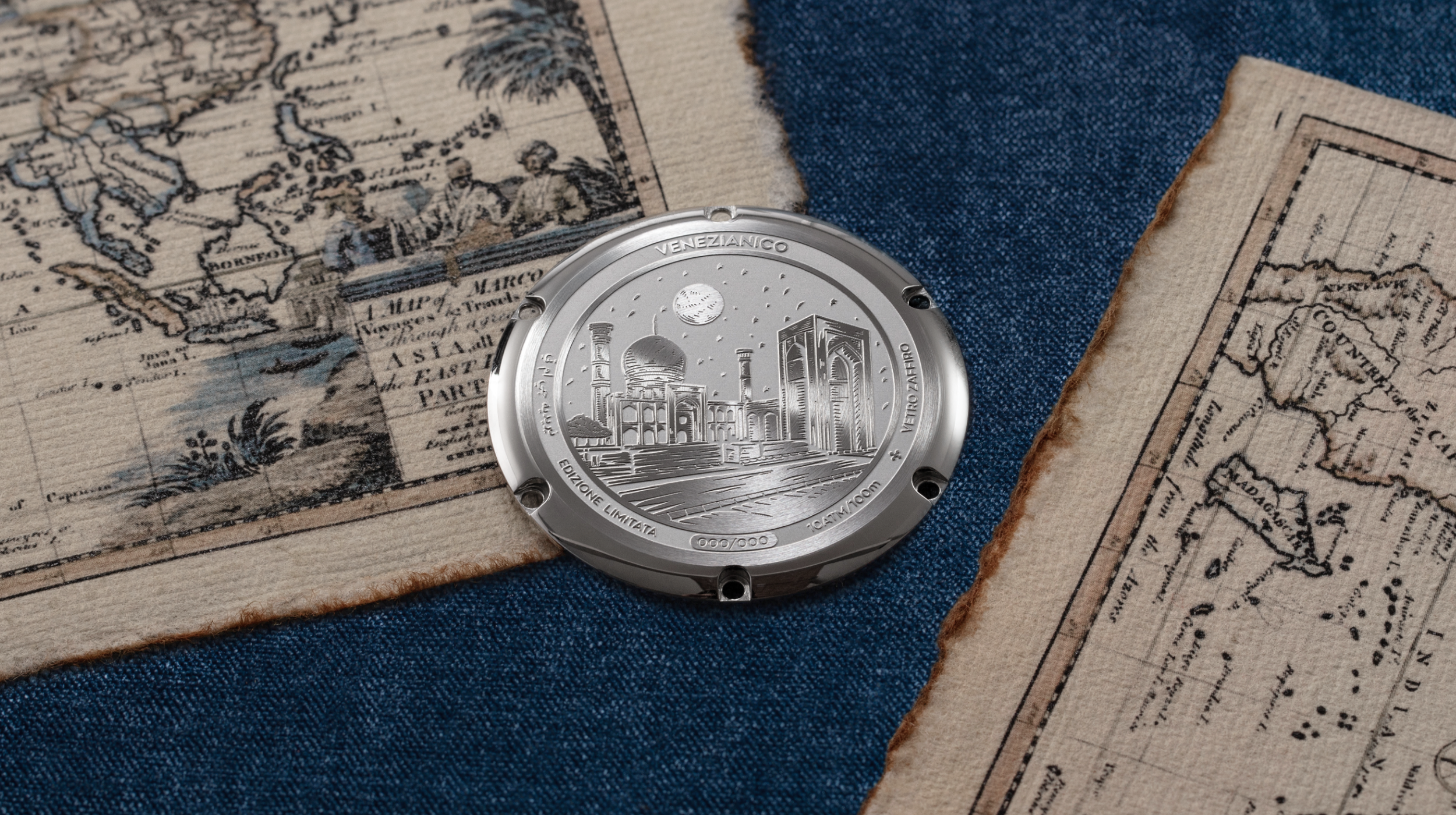 This limited edition of 300 pieces celebrates the cultural exchange between Venice and Central Asia, highlighting the artistic heritage of the region. Samarkand, a crossroads of the Silk Road and a key center of Timurid civilization, is the inspirational soul of this edition. The dial, handcrafted in mother-of-pearl mosaic, draws from ornamental motifs of the Persian tradition and features numerals in Persian script (Farsi), evoking the architectural elegance and cultural prestige of one of the most flourishing periods in Central Asian history.