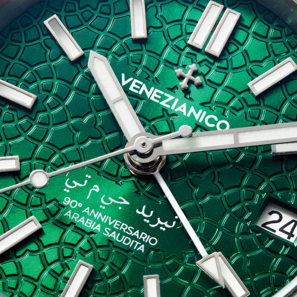 This concept celebrates the cultural exchanges between Venice and the Arabian Peninsula, highlighting Saudi Arabia's artistic heritage. Featuring an engraved brass dial with an arabesque pattern and Arabic numerals, this special edition reflects timeless tradition and craftsmanship.
