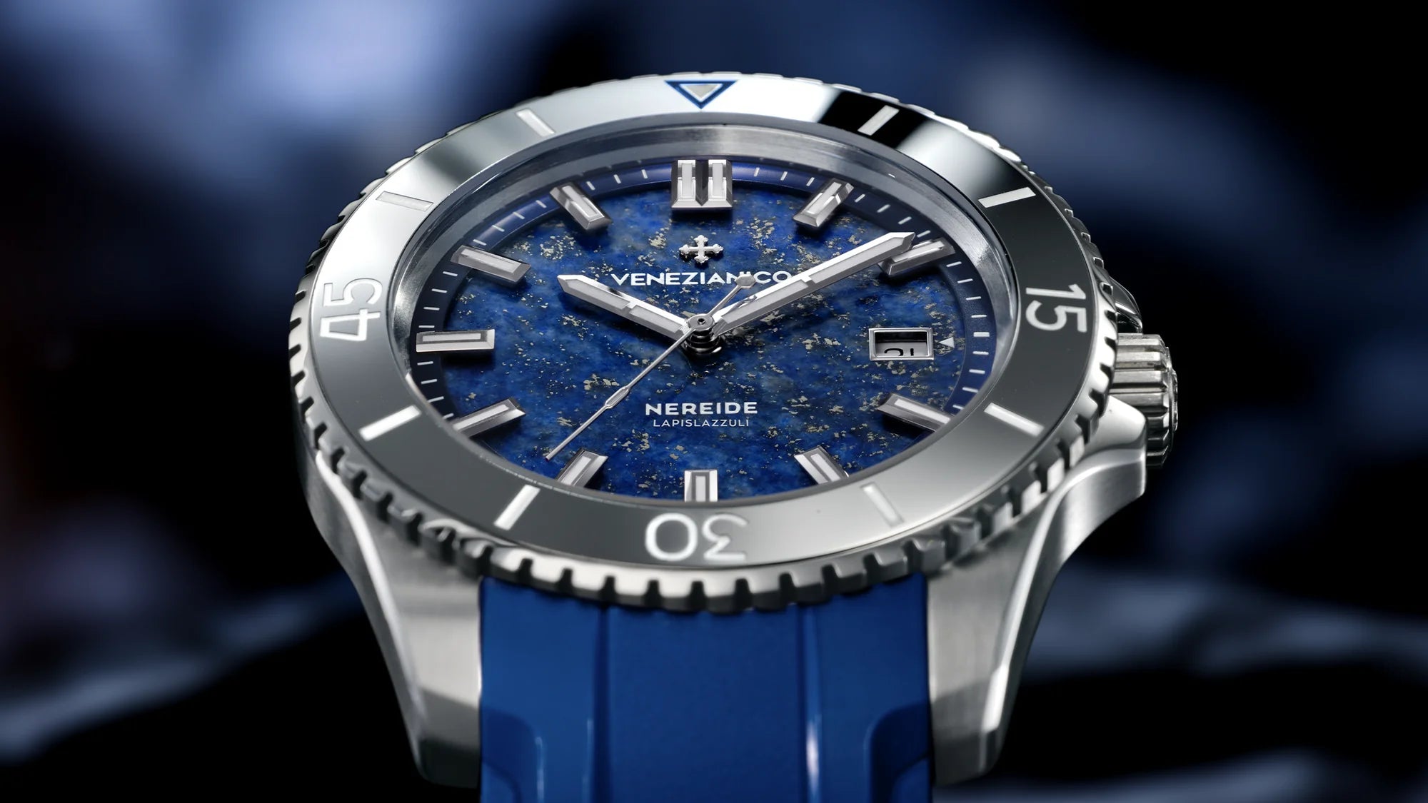 Nereide Lapislazzuli combines Venetian tradition with materials of exceptional value. The lapis lazuli dial, known for its intense blue and symbol of nobility, carries a millennia-old history. The robust case and tungsten bezel add strength and durability, creating a perfect balance between ancient art and innovation.