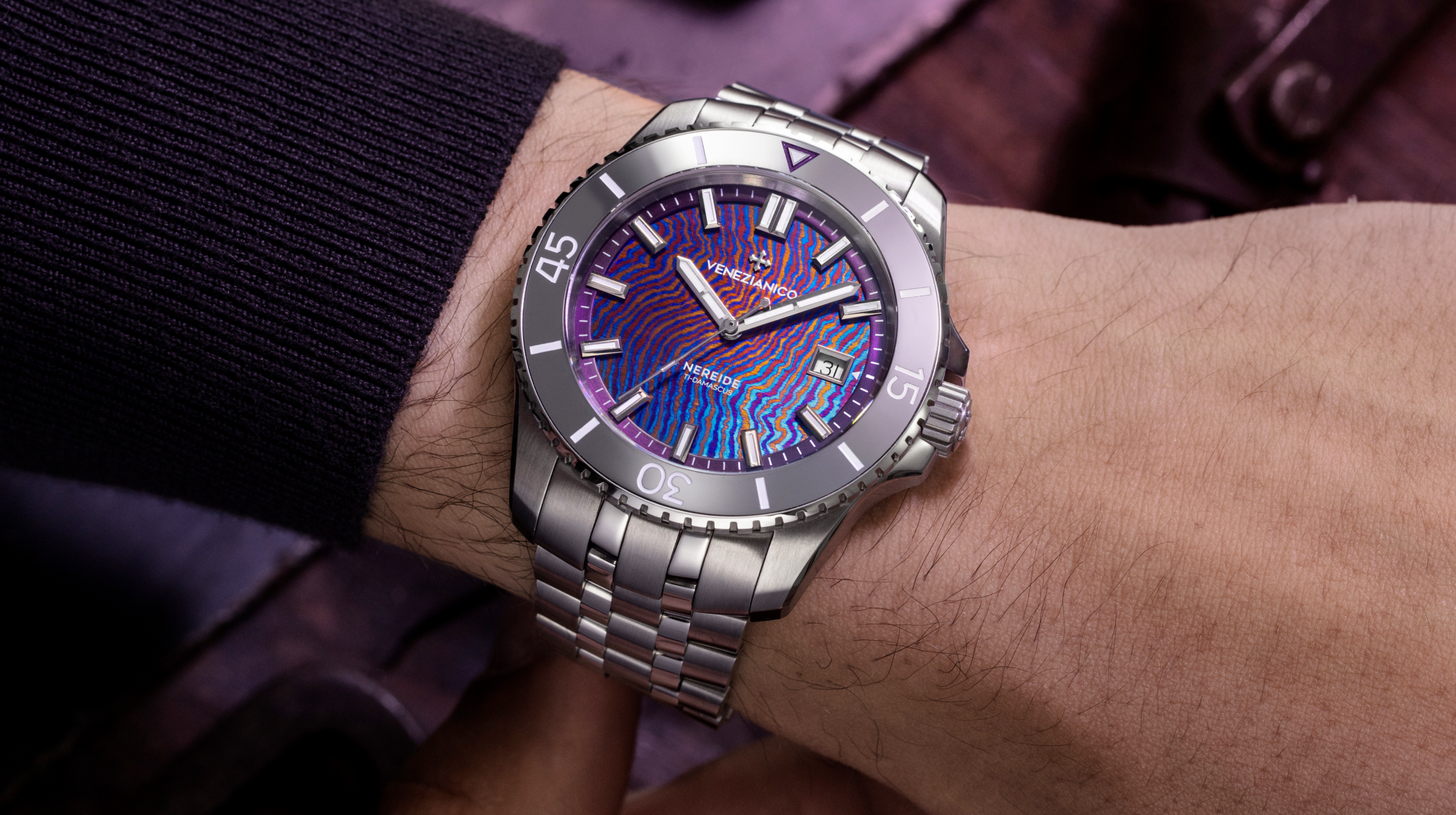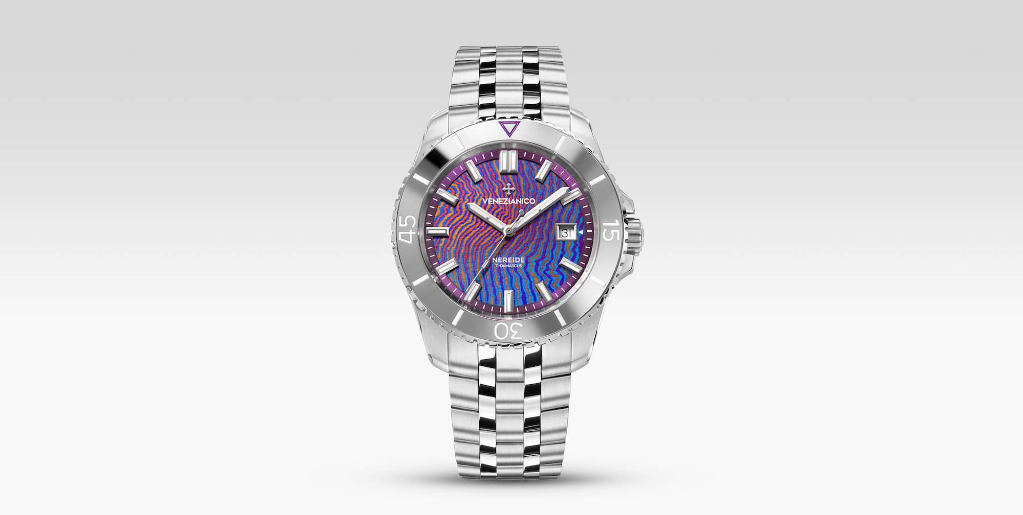 The Nereide Ti-Damascus is equipped with the Sellita SW200-1 caliber, chosen for its precision and reliability. What makes it unique is the skeletonized rotor developed in-house: a technical yet expressive element, decorated with radial Côtes de Genève and finished with anglage on the openings. The workmanship enhances the brilliance of the components and reveals glimpses of the movement in action. The purple IP treatment applied to the oscillating weight echoes the iridescent tones of the dial, creating a chromatic coherence that connects the front and back of the watch in a unified design vision.