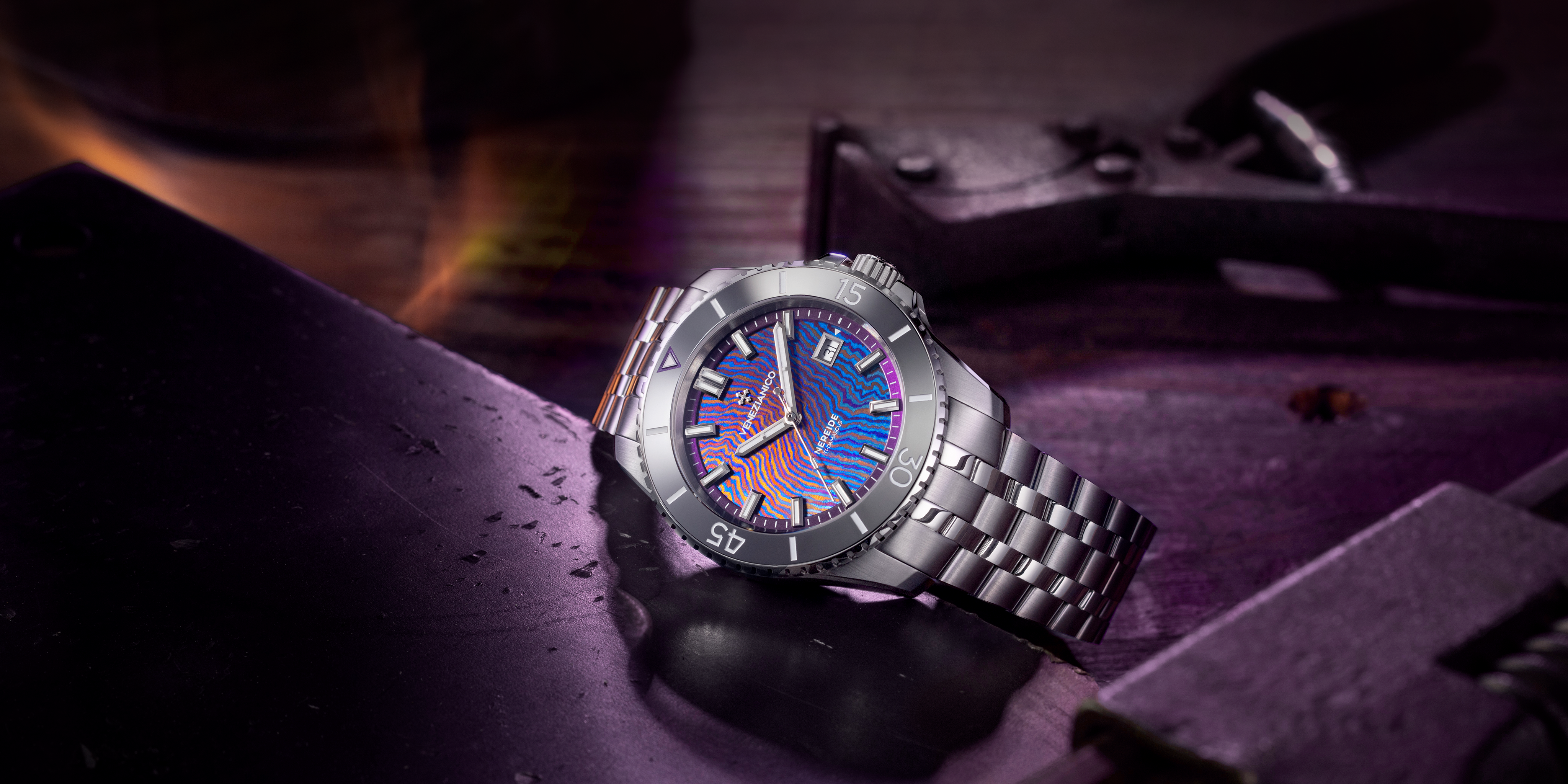 The dial is made of damascus titanium, a blend of different titanium alloys combined through lamination, high-temperature welding in a protected atmosphere, and meticulous manual processing. After forging, the surface is shaped, polished, and heat-treated to reveal distinctive patterns and reflections. The vibrant shades emerge from controlled oxidation and vary based on the alloy composition and the angle of the light.