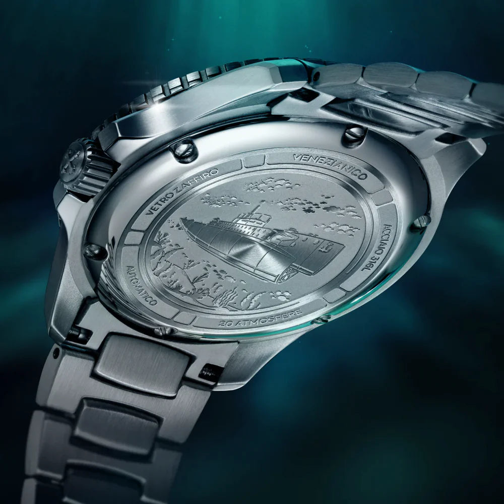 The submarine Nereide, which inspires the entire collection, is depicted submerged in the engraving at the center of the caseback, to remind how this watch doesn't compromise on underwater performance, retaining the ability to dive up to 200m deep and the rotating bezel that allows monitoring of dive times.