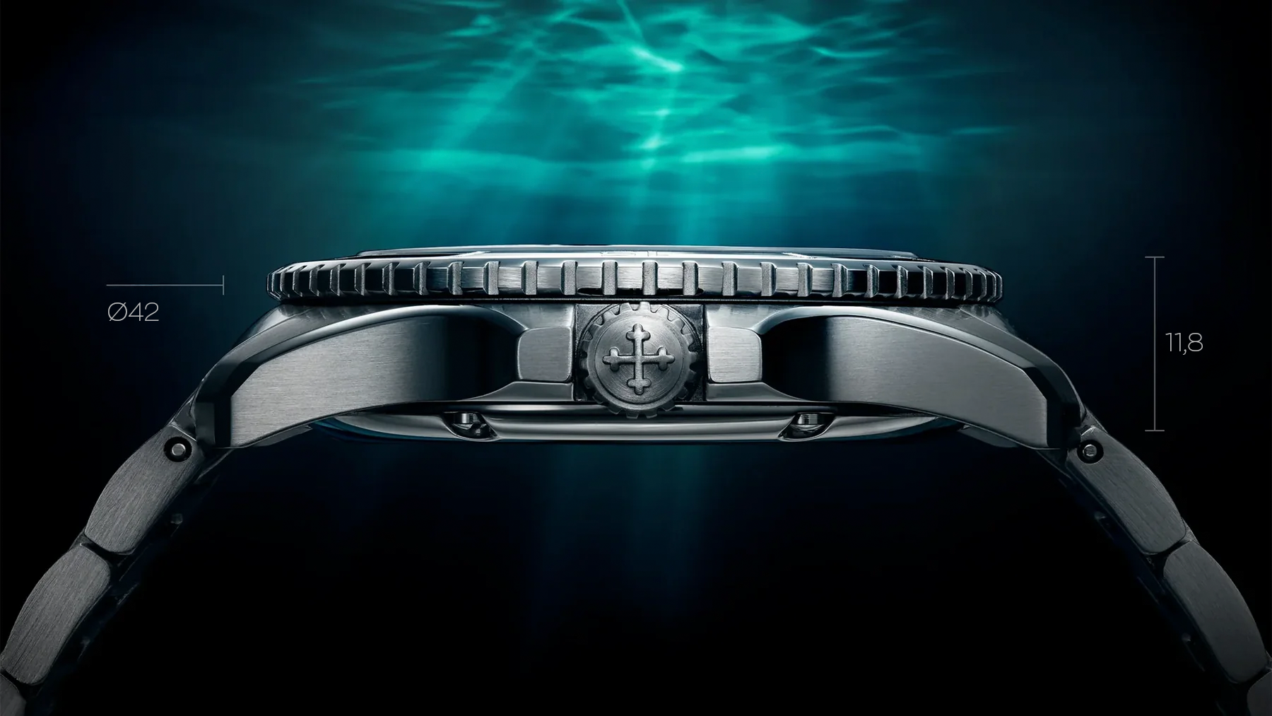 The submarine Nereide, which inspires the entire collection, is depicted submerged in the engraving at the center of the caseback, to remind how this watch doesn't compromise on underwater performance, retaining the ability to dive up to 200m deep and the rotating bezel that allows monitoring of dive times.