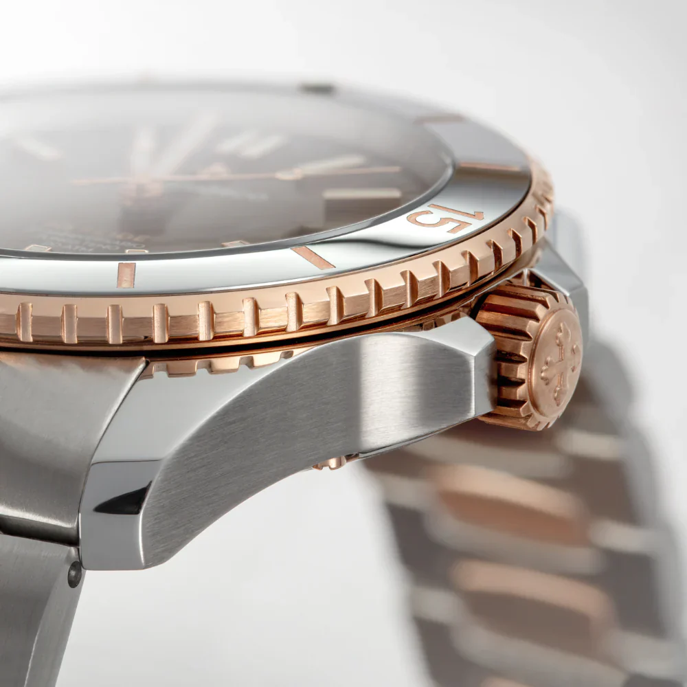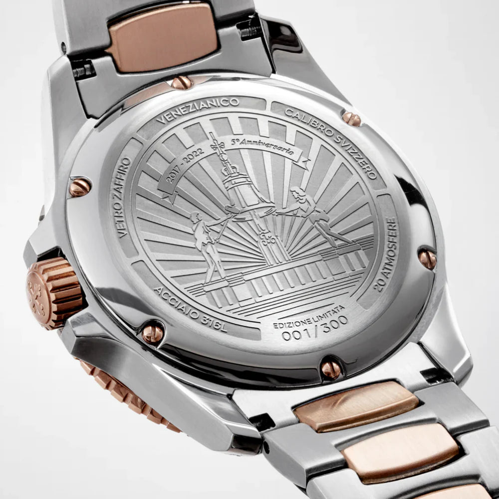 Our dive watch, water-resistant to a depth of 200 meters, takes its name from the Nereide submarine, a marvel of Venetian naval technology. This timepiece is engineered to endure strong stresses, making it particularly well-suited for water sports enthusiasts.