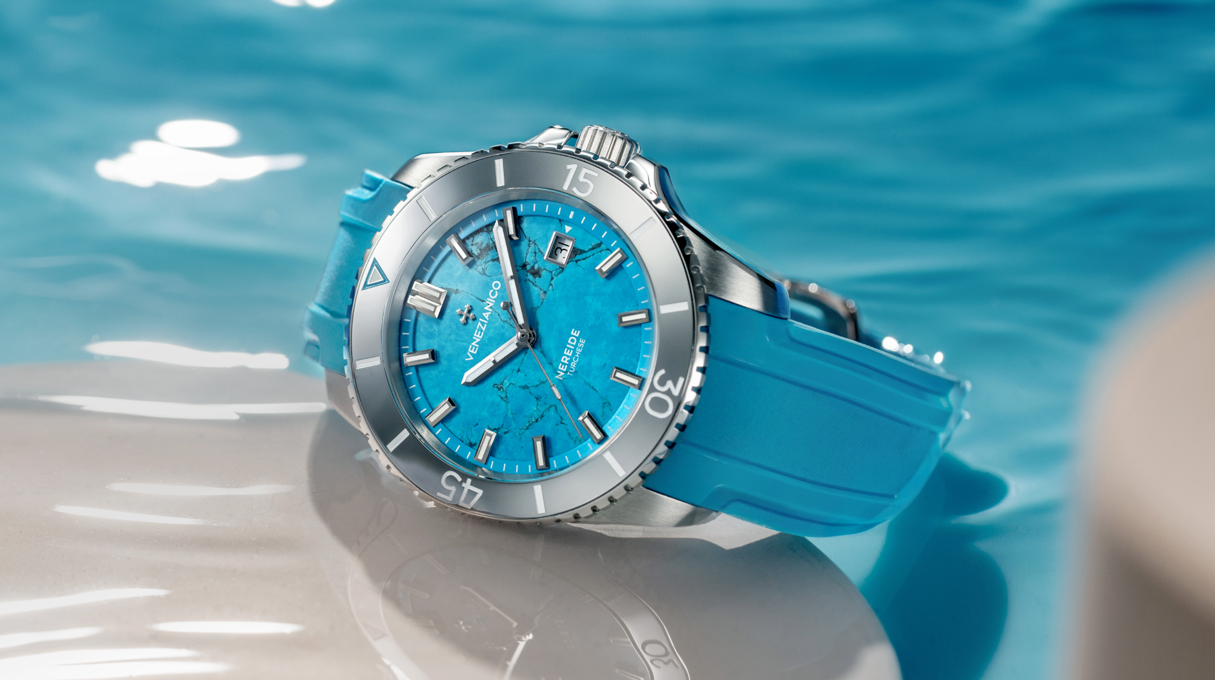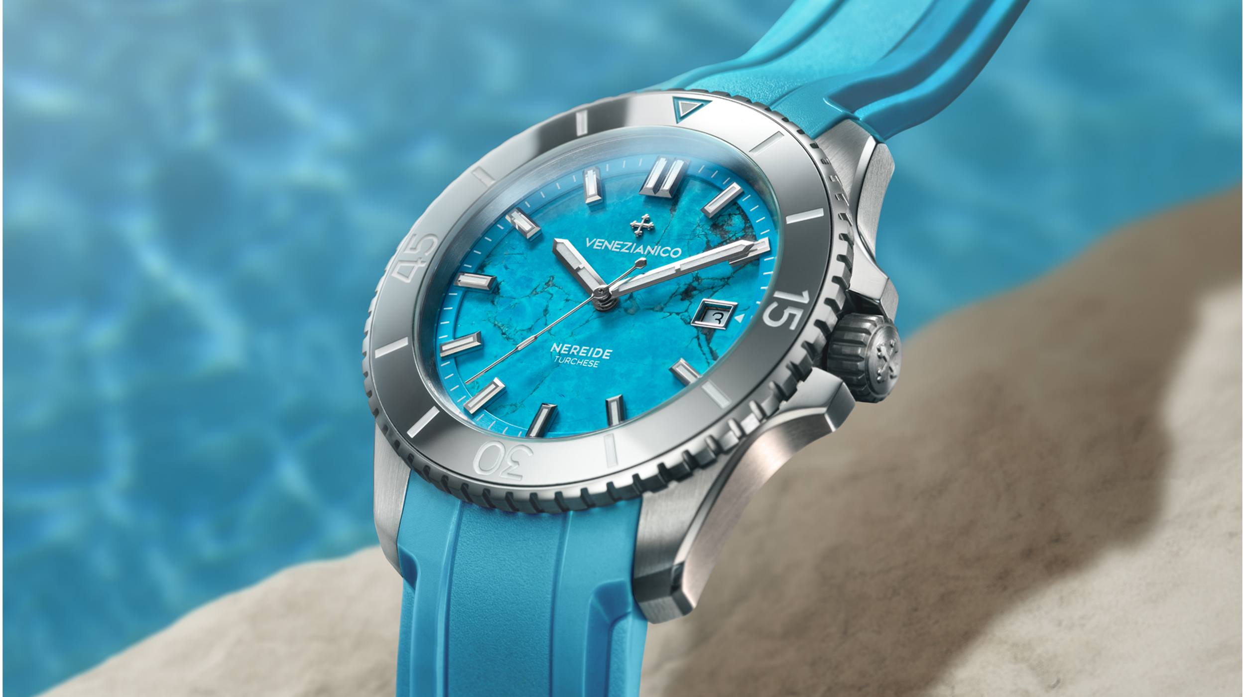 The natural turquoise dial reflects light with unique nuances, evoking the brightest colors of the Venetian lagoon. Its irregular veins recall stone submerged in water, making each watch one of a kind. The light blue strap echoes these tones and reinforces the connection to the sea, creating a timepiece that captures the authentic essence of Venice: vibrant, luminous, and constantly evolving.