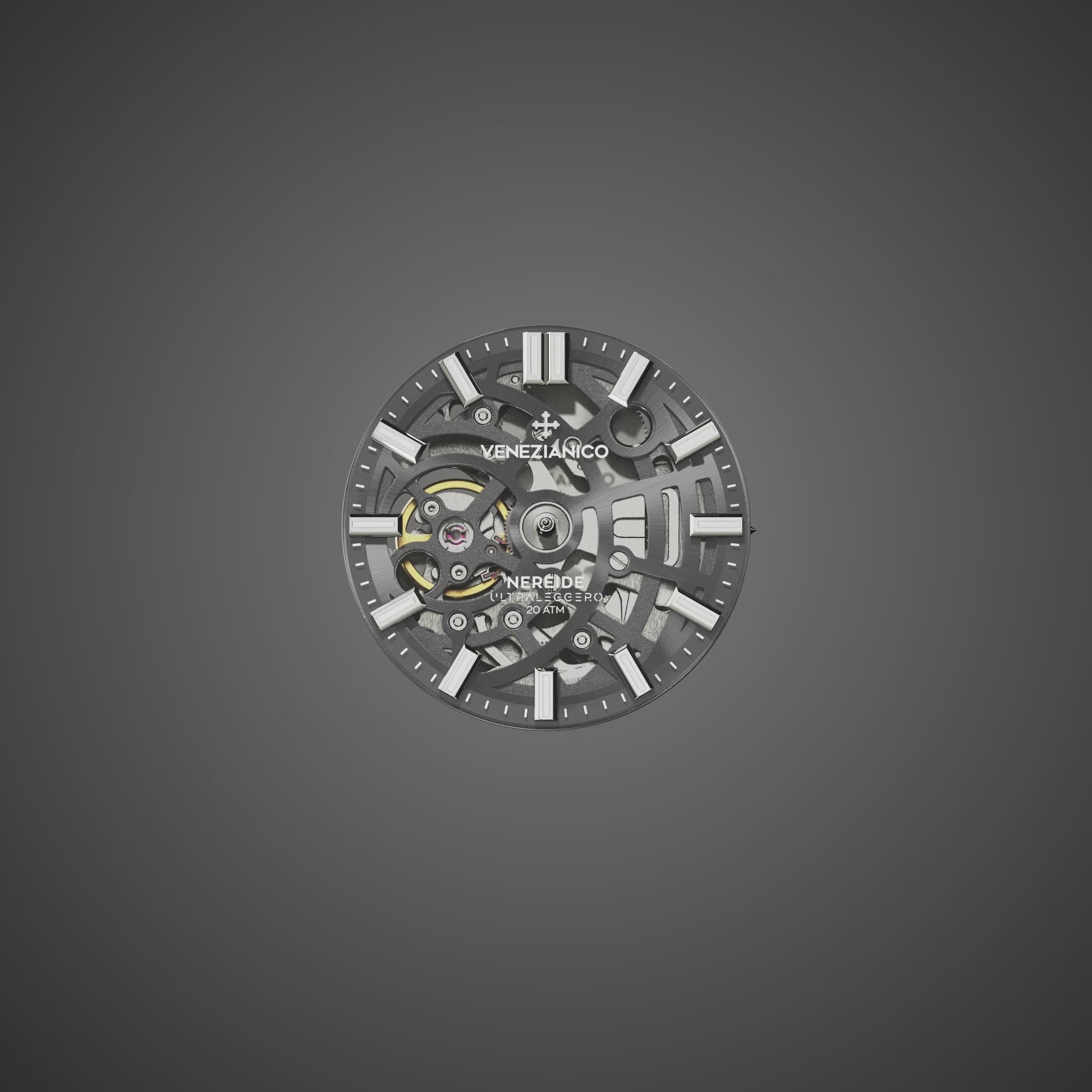 Ultraleggero is the most innovative watch in the Nereide series. It draws inspiration from the Vitruvian Man, symbolizing the Renaissance and the close connection between art and science. The peculiar shape of the skeletonized dial fits perfectly with the body of the movement, through an original patented system that guarantees greater lightness and less bulk.
