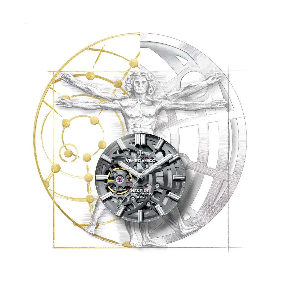 Ultraleggero is the most innovative watch in the Nereide series. It draws inspiration from the Vitruvian Man, symbolizing the Renaissance and the close connection between art and science. The peculiar shape of the skeletonized dial fits perfectly with the body of the movement, through an original patented system that guarantees greater lightness and less bulk.