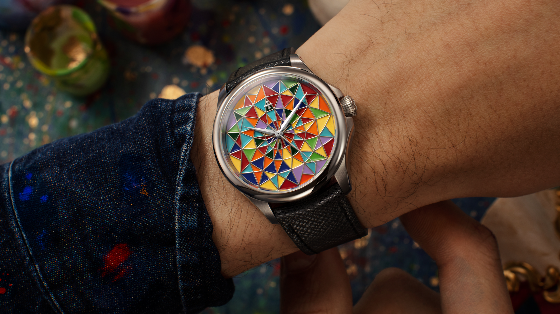 The dial is a mosaic of sculpted geometric sectors, each cell taking shape through polished surfaces and defined edges in silver-colored metal. The three-dimensional structure separates and enhances each hue, creating an orderly design that guides the eye between clean lines and precise angles. The enameled surfaces reflect light differently with every movement of the wrist, while the polished silver profiles enhance the geometry and add depth to the composition.