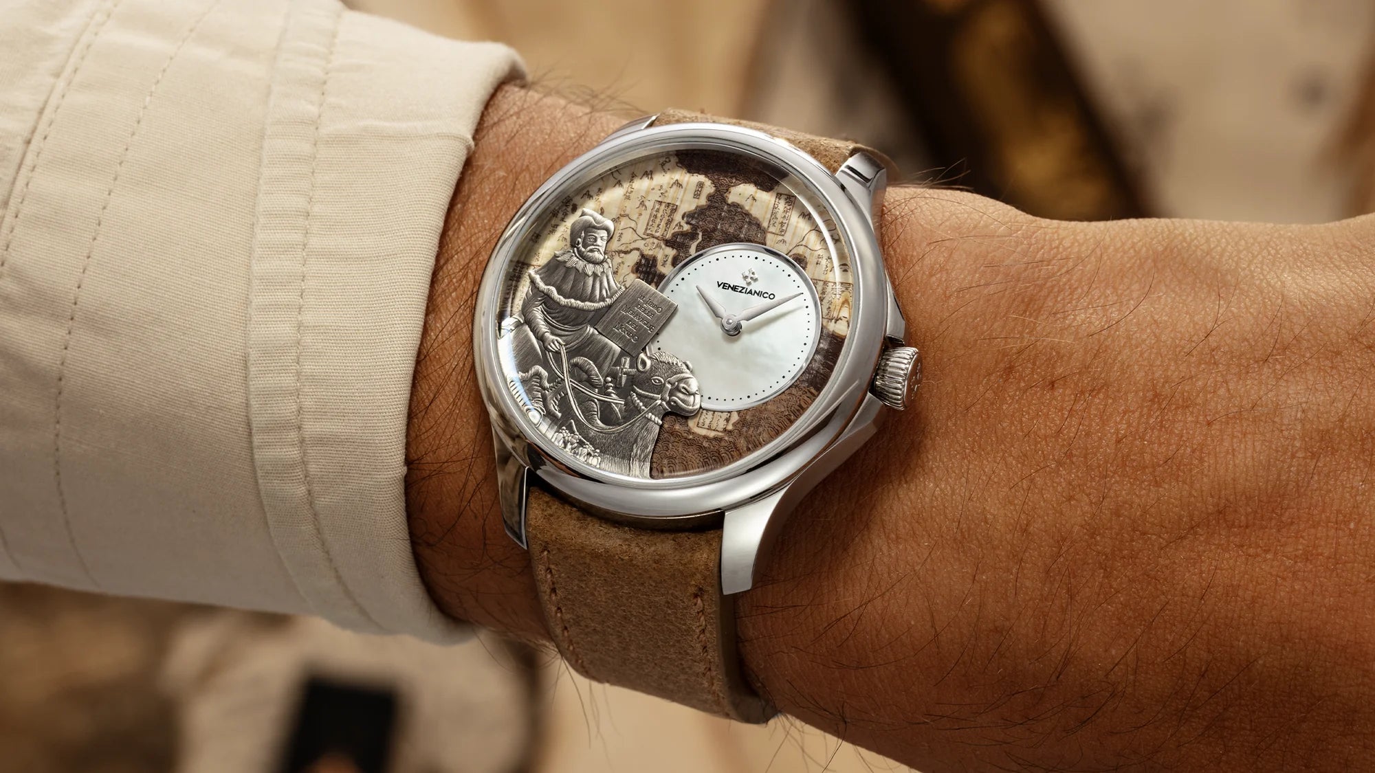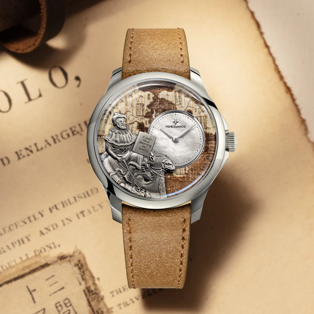 The watch dial celebrates the legendary Marco Polo on the 700th anniversary of his death. This Limited Edition captures the essence of his adventures with a brass bas-relief depicting him on a dromedary, holding "Il Milione." The papyrus background features a Chinese map of Asia, evoking his epic journeys to the East. A small mother-of-pearl dial, offset at 3 o'clock, enhances the composition with a touch of elegance, honoring the figure of the famous explorer.