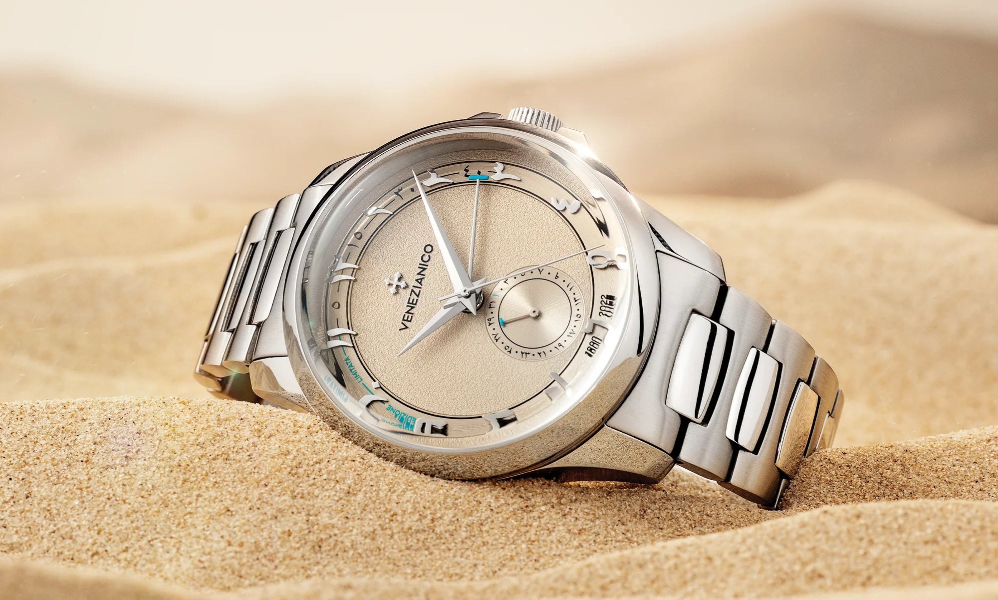 Granular finish evoking desert sand, satin-finished chapter ring, and hand-applied Arabic numerals